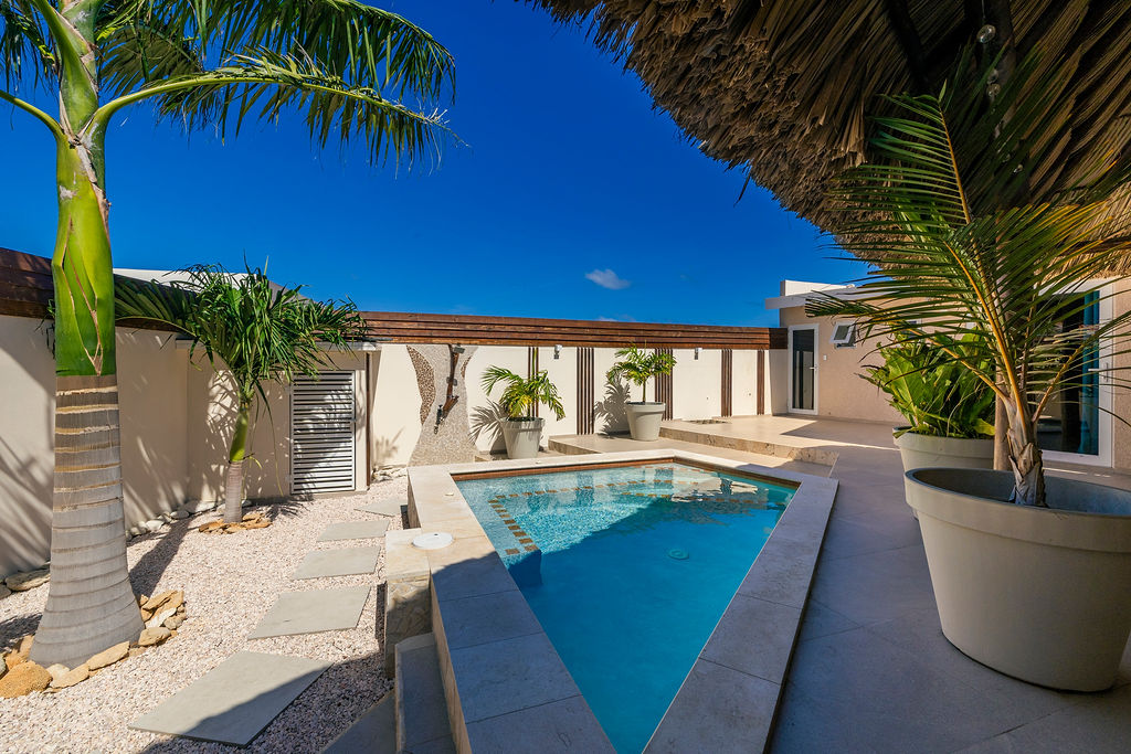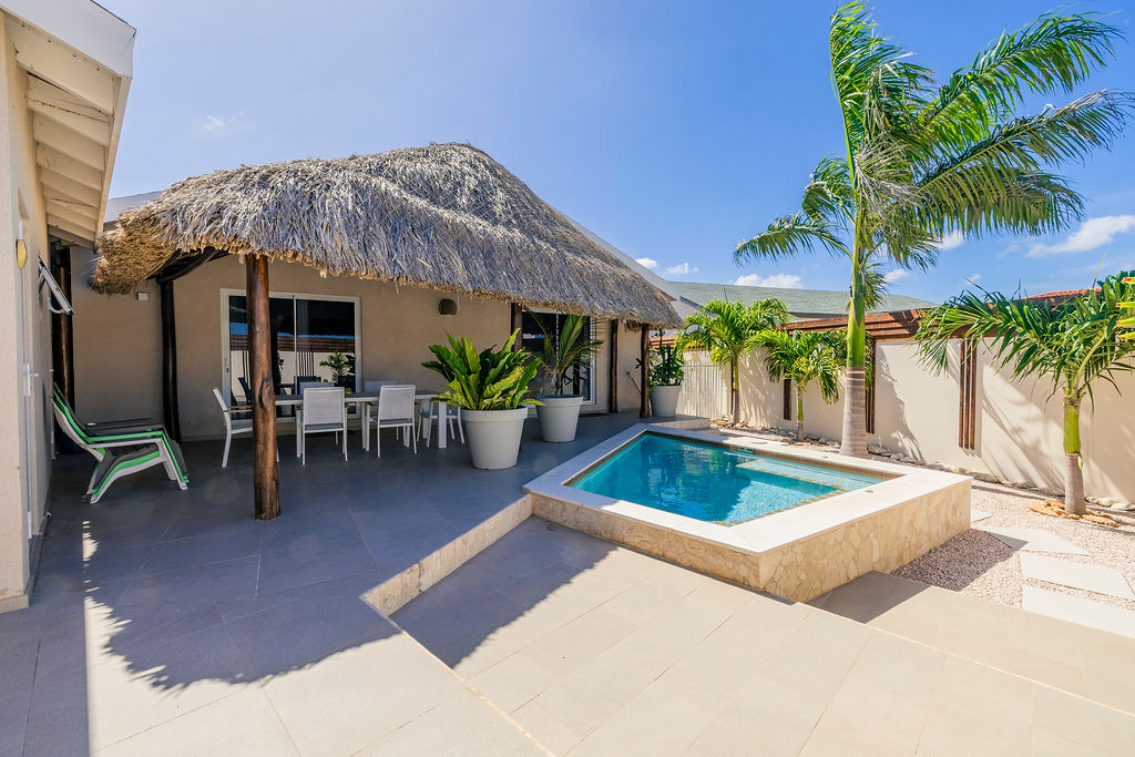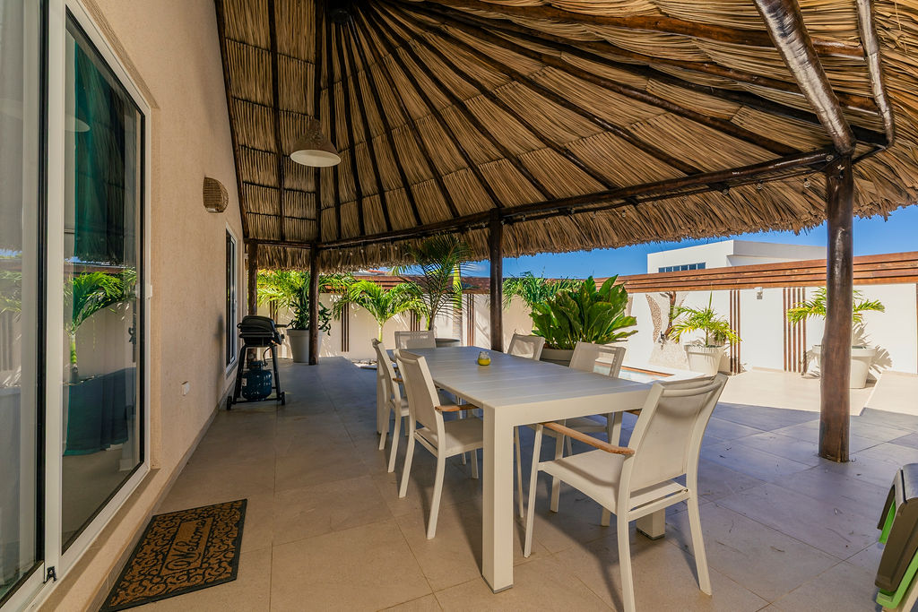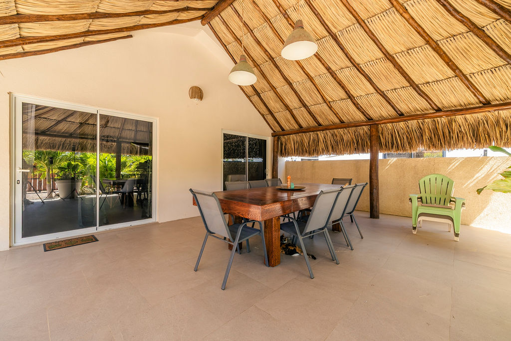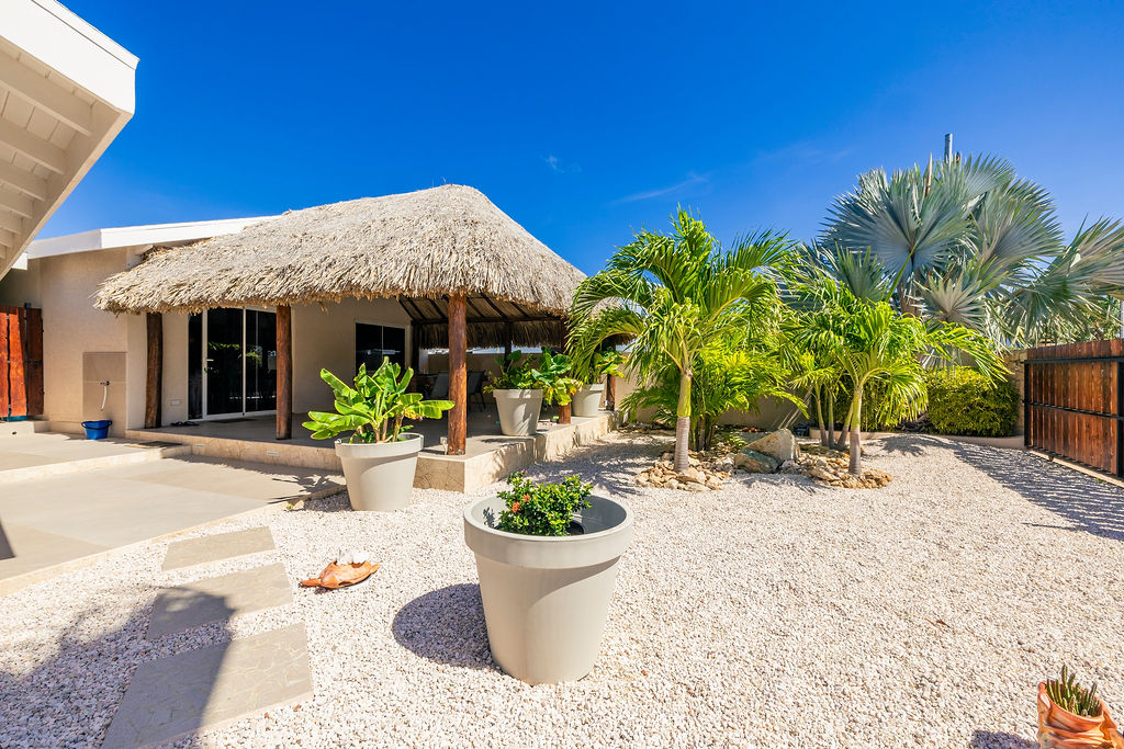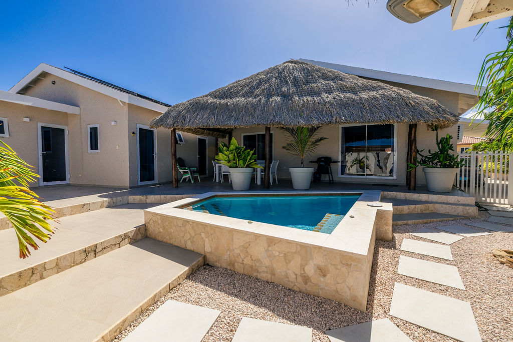Outdoors, the estate transforms into a private retreat. A shimmering pool sets the tone for sunny afternoons, while a charming gazebo creates a shaded oasis perfect for lounging or alfresco dining. The inviting BBQ area completes the picture, encouraging memorable gatherings in Aruba’s year round warmth.